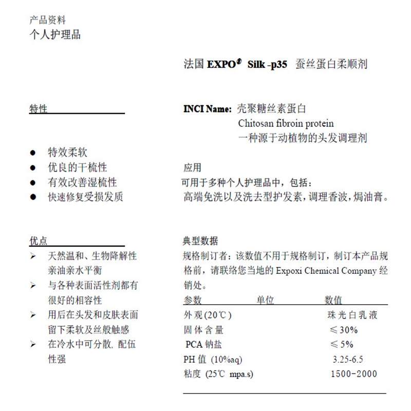 Mô tả sản phẩm EXPO® Silk-p35 là sợi tơ chitosan có nguồn gốc từ động vật và thực vật. Nó có khả năng phân hủy sinh học tốt và siêu bền dành cho tóc bị hư tổn nặng. Chứa protein tơ tằm giàu dưỡng chất và mềm mượt, ngăn ngừa hư tổn và chẻ ngọn cho tóc, giúp tóc khỏe, ẩm và mềm mượt. Silk-p35 đã cho thấy đặc tính dưỡng tuyệt vời ở nhiều loại tóc hư tổn.
