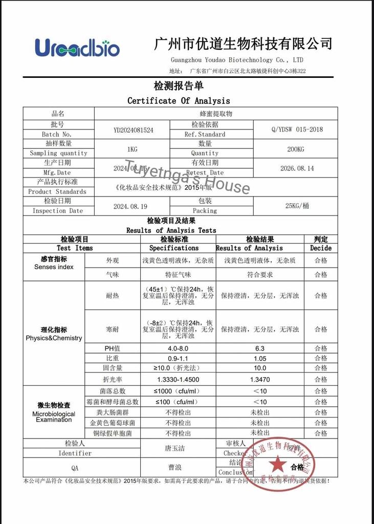 Tên INCI: Nước Cất ,glycerin,Chiết xuất mật ong 10%