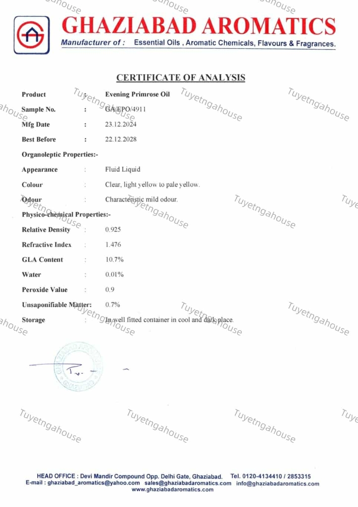 Dầu hoa anh thảo rất giàu axit béo thiết yếu. Các axit béo chính là axit gamma-linolenic (GLA: C18:3n-6) và axit linoleic (linoleic acid C18:2n-6). Hàm lượng GLA trong dầu hoa anh thảo nằm trong khoảng 8-10%. Hàm lượng axit linoleic là một trong những hàm lượng cao nhất được tìm thấy trong tất cả các loại dầu.